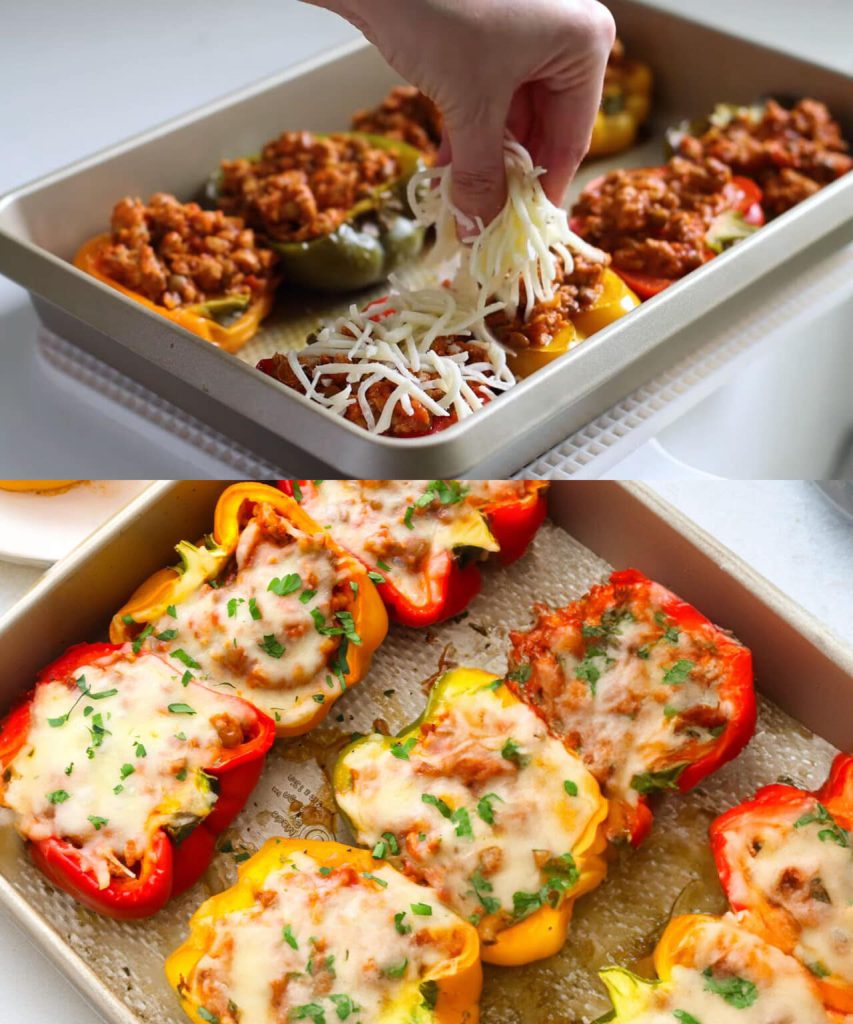 Ingredienti: 4 peperoni grandi 300 g di carne di tacchino macinata 150 g lenticchie (ad esempio verdi o marroni) 1 cipolla, tritata finemente 2 spicchi d’aglio, tritati finemente 1 carota,