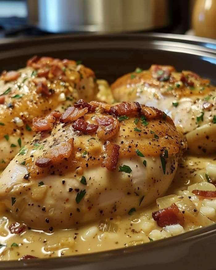 Metti questa ricetta su carta. Quando prepari un piatto delizioso come questo pollo cremoso al bacon a cottura lenta, l’odore rilassante di una cena fatta in casa si diffonde nell’aria